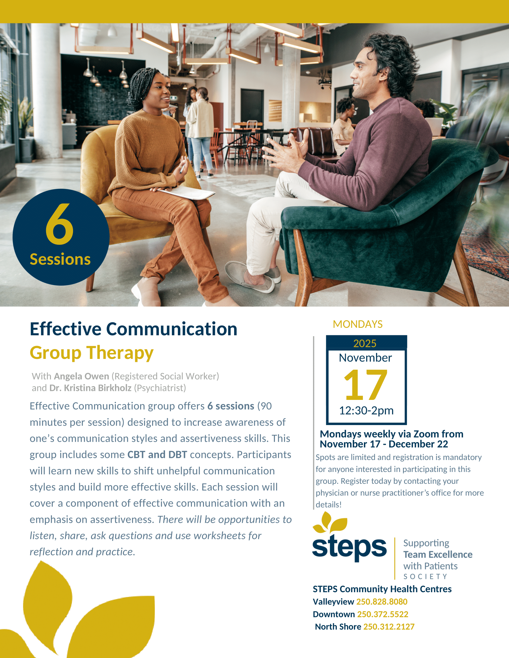 This group helps participants increase awareness of their own communication styles and learn assertiveness skills. Using concepts from CBT and DBT, participants will develop strategies to shift unhelpful communication patterns and build more effective, confident interactions. Each week covers a different aspect of communication, with opportunities to practice skills, reflect, and share. Facilitated by Angela Owen, RSW, and Dr. Kristina Birkholz.
