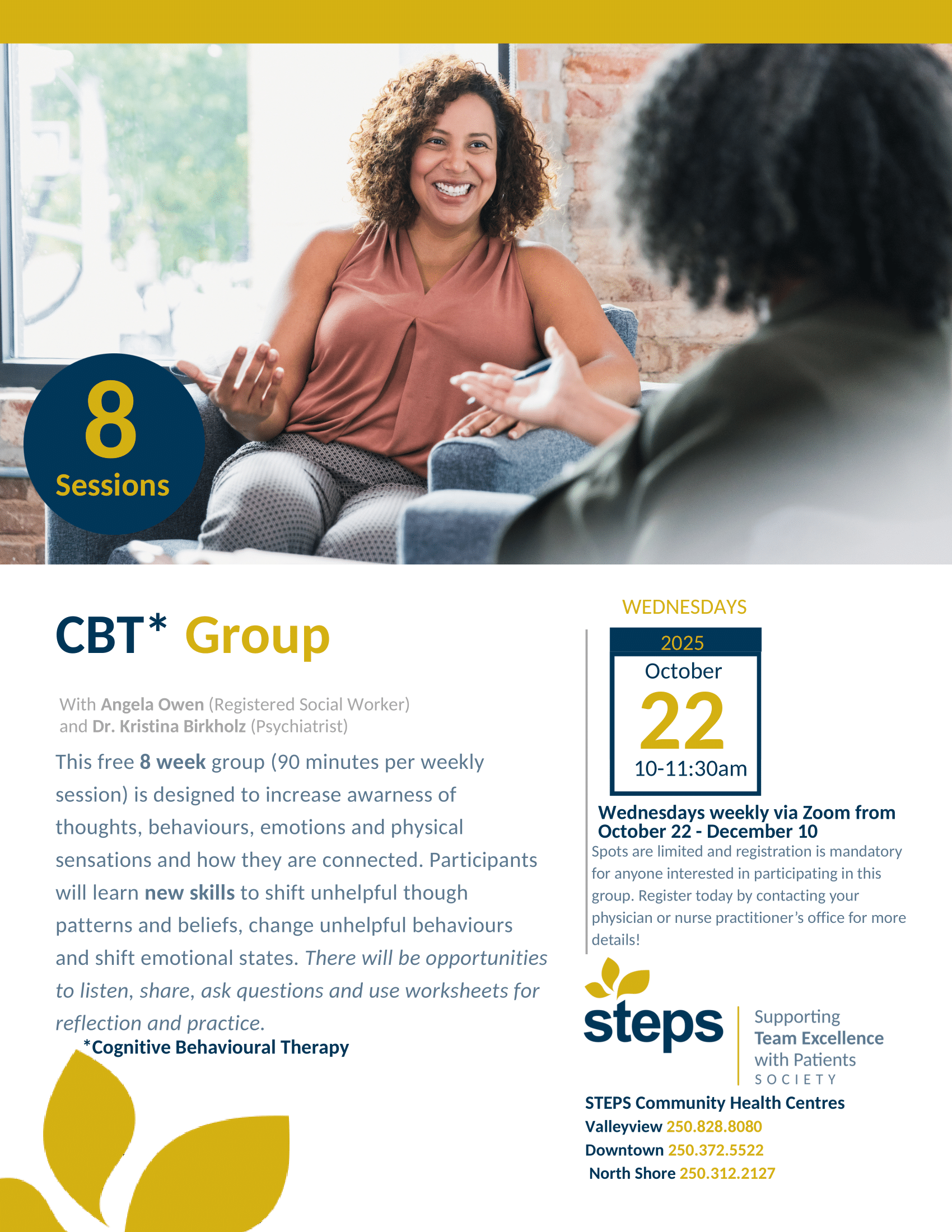This structured group focuses on the connection between thoughts, behaviours, emotions, and physical sensations. Participants will learn skills to shift unhelpful thought patterns and behaviours, improve mood, and manage emotional states more effectively. Sessions include guided discussion, reflection, and practical worksheets to build skills over time. Facilitated by Angela Owen, RSW, and Dr. Kristina Birkholz.